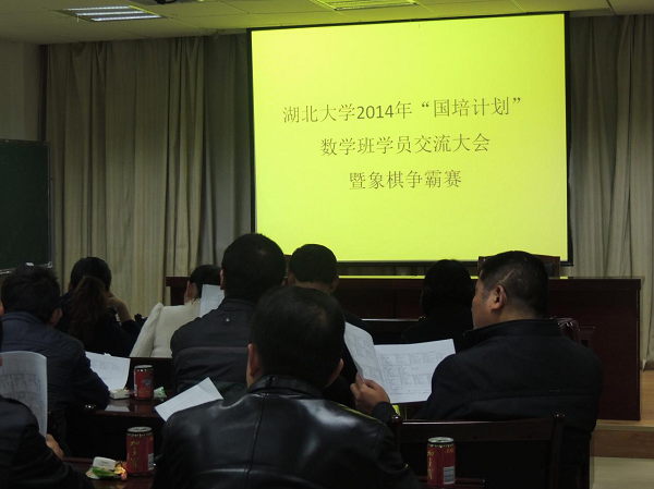 11月16日晚7点,学院在201报告厅举行2014年“国培计划”数学班学员交流大会暨象棋争霸赛。此次活动旨在缓解学员学习压力,丰富他们的课余活动,让来自全国各个地方的学员,感受到一个令人印象深刻的湖北大学。