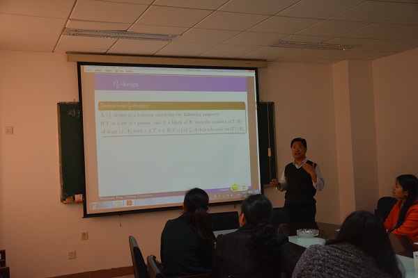 2015年3月24日下午,北京大学数学科学学院博士生导师冯荣权教授应邀来访我院,为学院师生做了一场题为《(1+1/2)-design, its construction and applications》的学术报告。