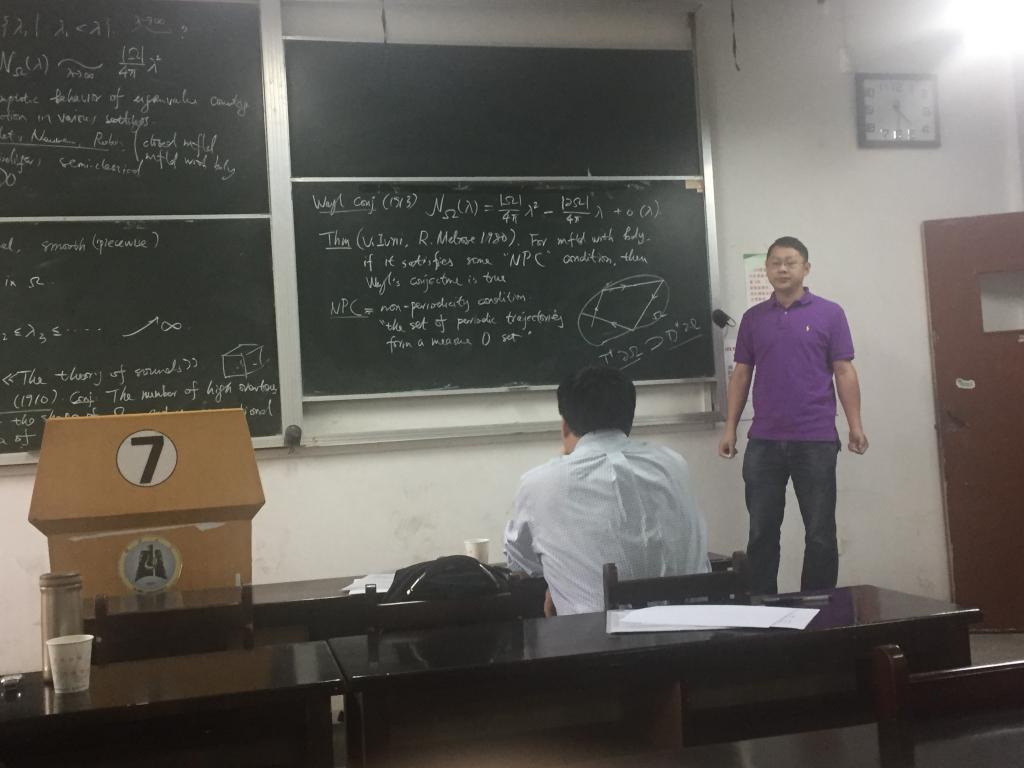 王作勤教授在报告中介绍了Weyl猜想的情况,给出了他与合作者关于平面圆盘上Weyl渐近公式中余项精度估计的最新进展,并简略讲解了证明思路。