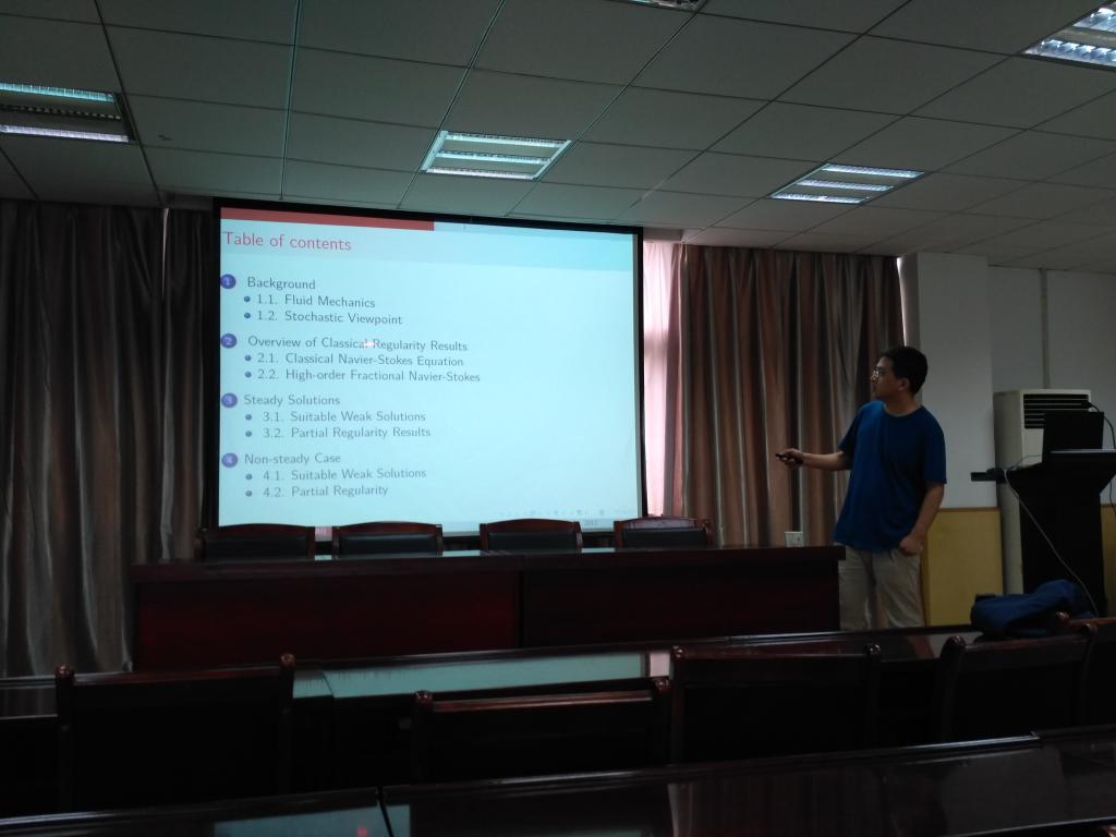 唐岚副教授在报告中介绍了他关于一类分式Navier-Stokes方程解的存在性和正则性的最新进展,并简略讲解了证明思路。