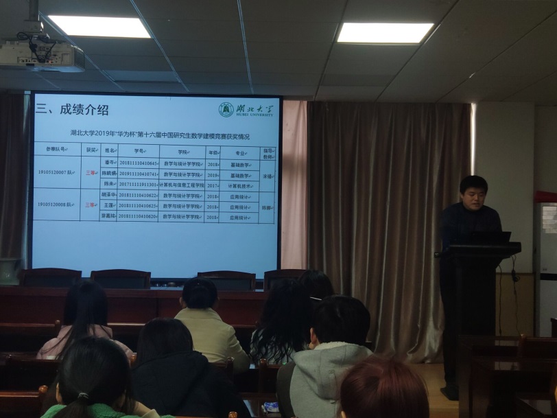 报告会伊始,陆伟书记就全国大学生数学建模比赛和全国研究生数学建模比赛和我院研究生所取得的成绩进行简单的介绍,鼓励同学们积极参与。