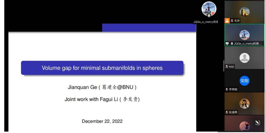 2022年12月22日下午,北京师范大学葛建全教授应邀为我院相关专业的教师与研究生做了题为“Volume gap for minimal submanifolds in spheres”的线上学术报告。
