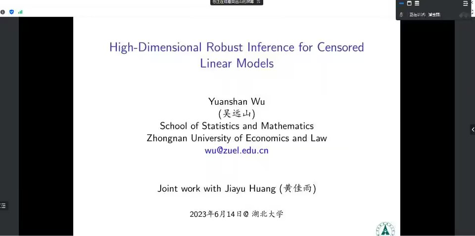 2023年6月14日下午,中南财经政法大学吴远山教授应邀为我院相关专业的教师与研究生作了题为“High-dimensional robust inference for censored linear models”的线上学术报告。