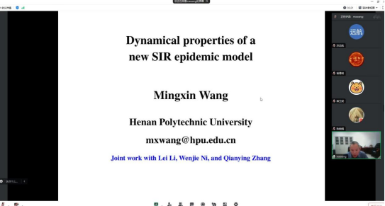 2023年11月16日下午,河南理工大学王明新教授应我院刘思妤老师邀请,为几何团队师生作了题为“The dynamical properties of a new SIR epidemic model”的线上学术报告。