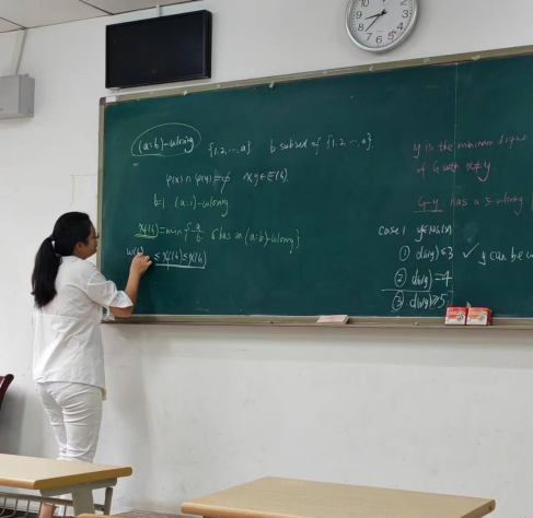 -free graphs》。胡小兰老师首先向大家介绍了报告相关的概念以及研究背景,接着向大家报告了他们团队关于fractional chromatic number的最新研究成果。胡小兰老师的讲解非常详细,思维严谨,极大鼓舞了青年教师和学生们的学术热情,给大家带来了很多启示。