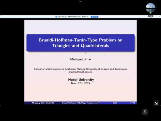 2025年11月27日,南京理工大学翟明清老师应我院刘慧清教授邀请,为我院师生作线上学术报告,报告通过腾讯会议在线举行。会议由刘慧清教授主持,来自运筹学与控制论专业的教师、博士和硕士研究生参与了报告的听取、讨论。