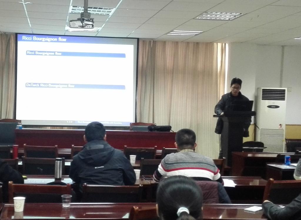 朱教授在报告中主要介绍了Ricci Bourguignon flow在边界流形上存在性的几何问题,并假设初始度量有恒定平均曲率及满足一些兼容性条件,向大家详细讲述了这些条件,最后得出了一些Ricci Bourguignon flow和恒定平均曲率在边界上的结论。朱教授的报告使在座师生对自己学科方面的相关走向有了更加深入的了解,同时也给在座学生对自己未来的发展方向一定的启迪。