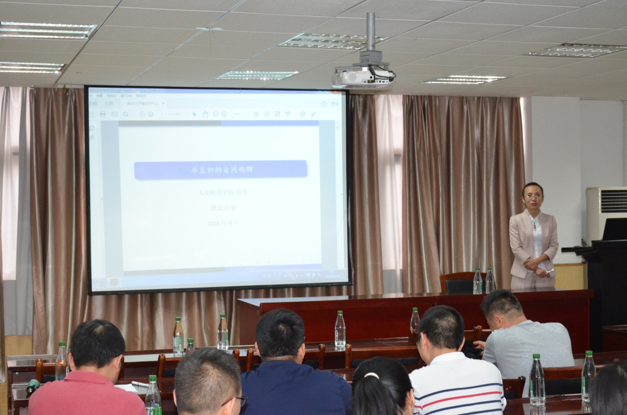 太原师范学院周芳副教授做了题为“半直积的自同构群”的报告。周教授由一些初等的结果出发,首先介绍了直积的自同构群的相关知识,然后对半直积的自同构群的结果做出介绍,包括:半直积的稳定自同构,半直积的自同构群的中心化分解,可裂亚循环p-群的自同构群,半直积的自同构群的正规化分解以及一类圈积的自同构群。