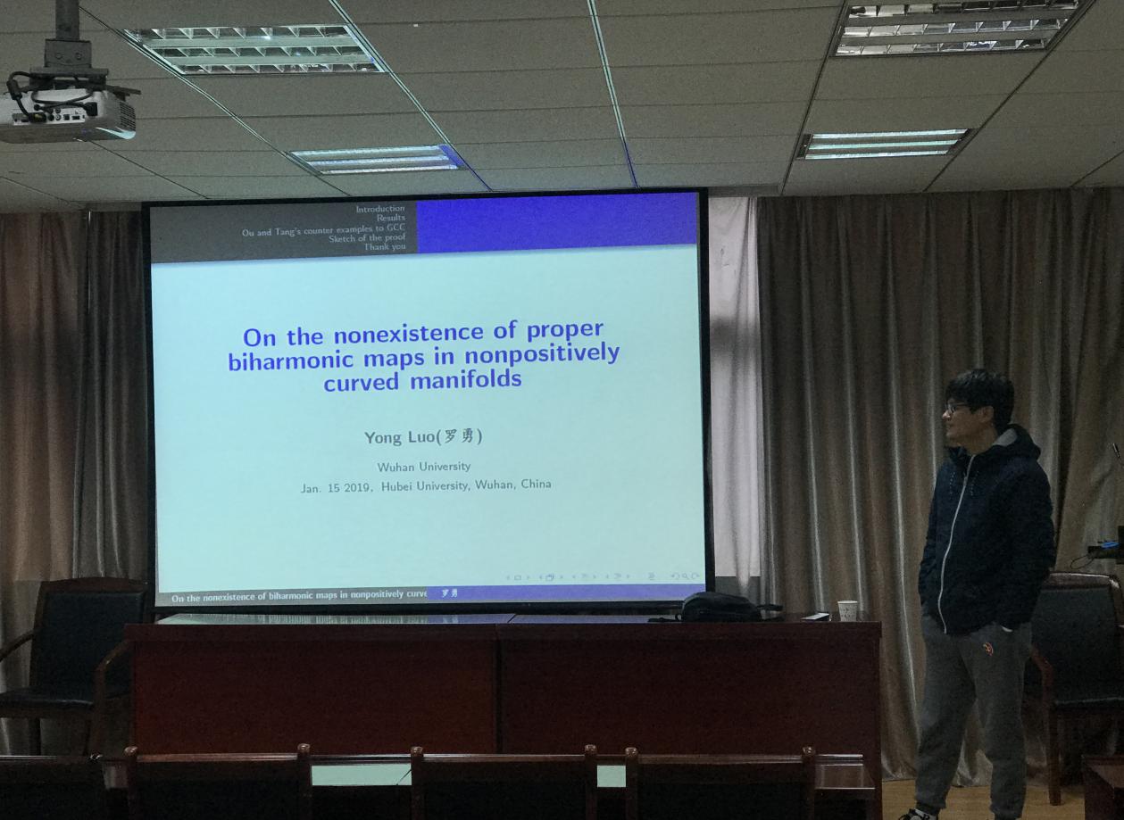 2017年1月15日上午,武汉大学数学与统计学院罗勇教授来学院讲学,在海角天涯社区网页入口登录201报告厅作了题为On the nonexistence of proper biharmonic maps in nonpositively curved mannifolds的学术报告。听了罗勇教授的讲座,全体师生获益颇多,受益匪浅。