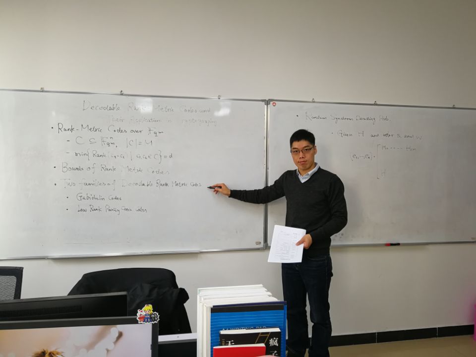 报告中,李春雷教授对比特币区块链以及区块链相关问题进行了简明的阐述,对decodable rank-metric码进行了详细的介绍并讨论它们在后量子密码学中的应用,并且与在座师生展开了深入的讨论与交流,使大家受益匪浅。