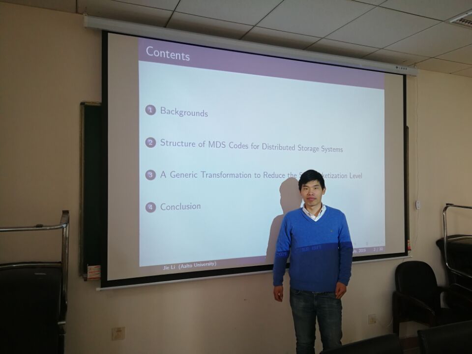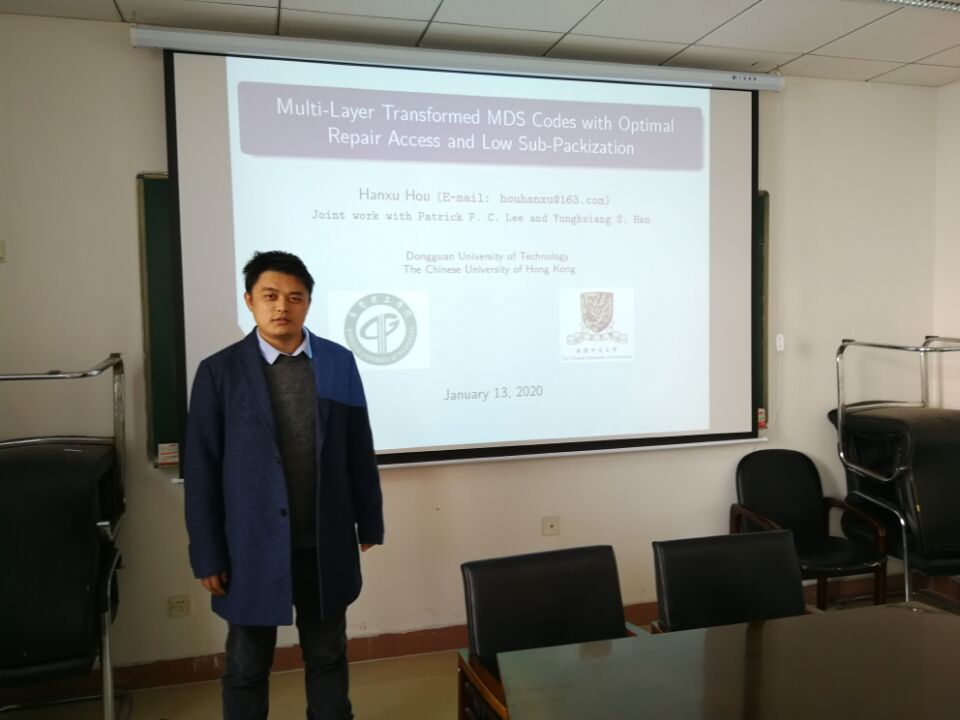 2020年1月13日,网络编码专家侯韩旭和李杰博士应邀来访我院,在院203为相关师生分别做了题为《Multi-Layer Transformed MDS Codes with Optimal Repair Access and Low Sub-Packetization》和《Systematic Construction of MDS Codes with Small Sub-packetization Level and Near Optimal Repair Bandwidth》的学术报告。
