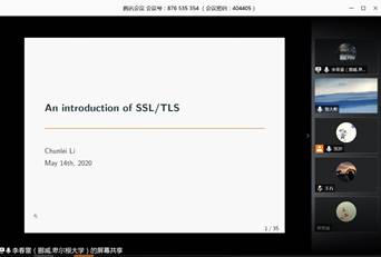 李春雷教授报告共包含两部分:《A Brief Summary of Cyber Security》和《An Introduction of SSL/TLS》,报告介绍了网络安全的发展概况和网络通信在TCP/IP传输层的安全协议SSL/TLS。