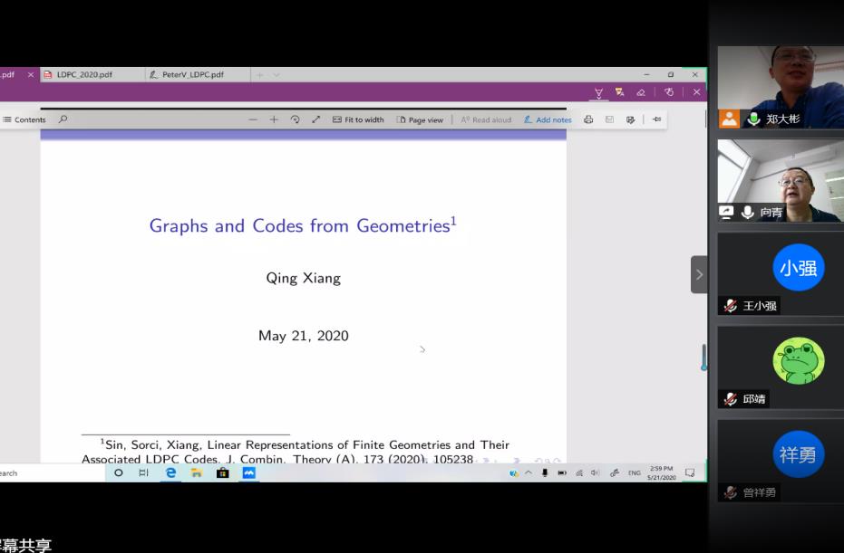 2020年5月21日下午,美国特拉华大学(University of Delaware)向青教授为我院部分老师和研究生带来了一场精彩的线上学术报告,报告通过腾讯会议在线举行,旨在帮助同学们理解几何、编码和图之间的关系。郑大彬教授主持本次会议,海角天涯社区网页入口登录院长曾祥勇教授以及数十名研究生参与报告的听取、讨论。