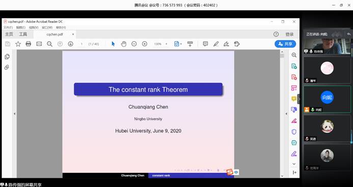 2020年6月9日上午,宁波大学陈传强教授应我院向妮教授邀请,为我院几何团队作线上学术报告,报告通过腾讯会议举行。会议由向妮教授主持,来自我院几何分析团队的教师、研究生10余人参与了报告。