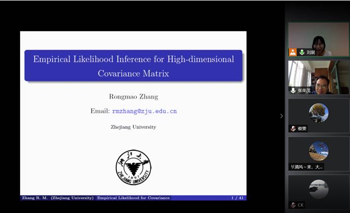 2020年7月17日上午10点,浙江大学数学学院张荣茂教授应我院刘展教授邀请,为我院师生作线上学术报告。报告通过腾讯会议在线举行,由刘展教授主持,来自应用统计学专业的教师、硕士研究生等共35人参与了报告的听取与讨论。