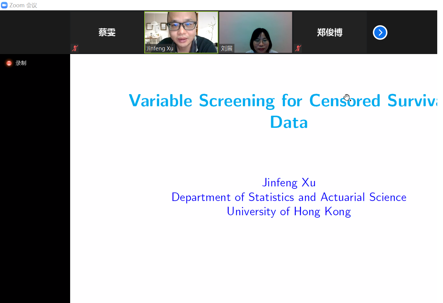 2020年7月29日下午3点,香港大学理学院统计与精算学系徐锦峰教授应我院刘展教授邀请,为我院师生作线上学术报告。报告通过zoom会议在线举行,由刘展教授主持,来自应用统计专业的教师、硕士研究生等共15人参与了报告的听取与讨论。