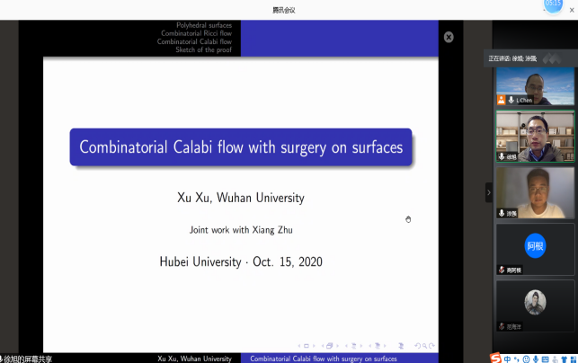 2020年10月15日上午,武汉大学徐旭教授应我院陈立老师邀请,作线上学术报告。报告通过腾讯会议举行,由陈立老师主持,来自我院几何团队的教师、研究生10余人参与了报告的听取和讨论。