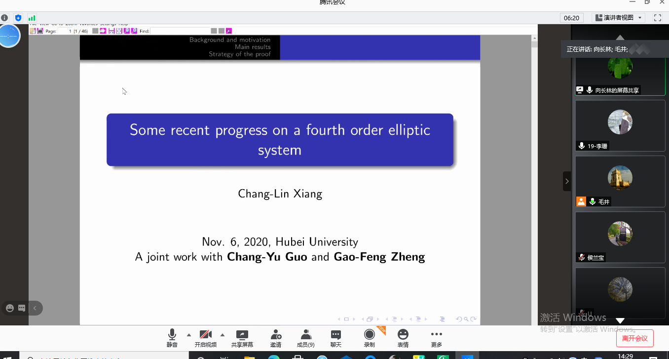 2020年11月6日下午,长江大学向长林教授应邀为我院相关专业的教师与研究生做了题为“Some recent progress on a fourth order elliptic system”的线上学术报告。