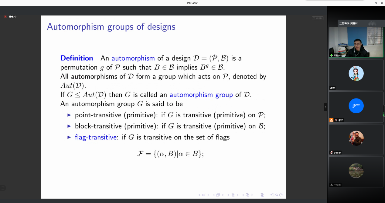 刘伟俊教授做了题为“广义凯莱图的自同构”的报告,报告首先介绍了广义凯莱图的基本性质,然后定义了GCI群,讨论了交换群和二面体群的GCI性。