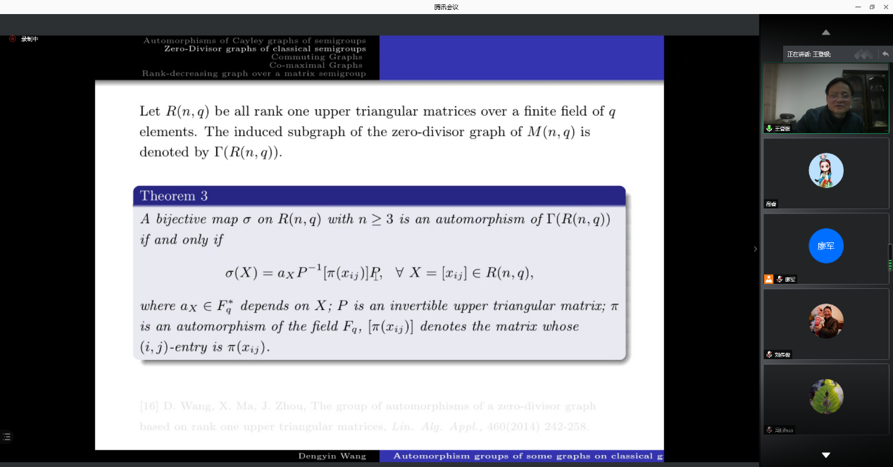 王登银教授做了题为“基于典型群的图的自同构群”的报告,报告介绍了近期在基于典型群、矩阵半群上的一些图的自同构群的研究进展。