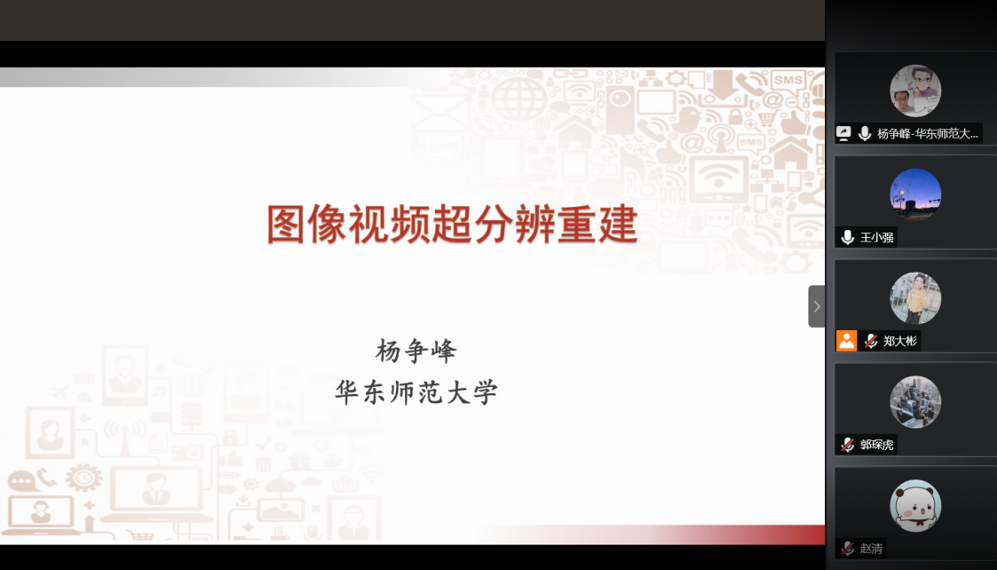 杨争峰教授的报告题目为《图像视频超分辨重建》,本次报告介绍了图像或视频超分算法的工作原理以及基于深度学习技术,重新设计并提出自研的超分核心技术算法的关键性问题。给出了若干基于深度学习的时空视频超分技术和视频插帧方法,进一步讨论视频超分方法在工程中的实际应用以及目前超高清产业在发展过程中,为获得超清图像图像或视频所面临的挑战。