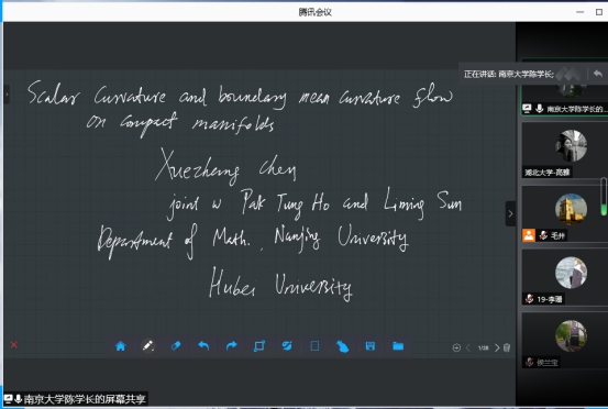 2021年5月14日下午,南京大学陈学长教授应邀为我院相关专业的教师与研究生做了题为“Scalar curvature and boundary mean curvature flow on compact manifolds”的线上学术报告。
