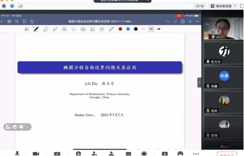 2021年7月7日下午,四川大学杜力力教授应我院向妮教授邀请,为几何团队师生作了题为“椭圆方程自由边界问题及其应用”的线上学术报告。