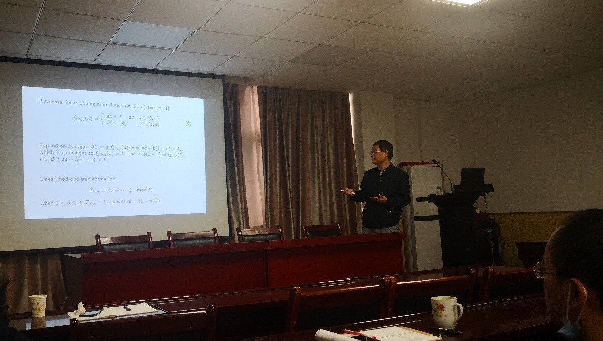 2021年10月8日上午,武汉理工大学数学科学研究中心副主任丁义明教授应邀在海角天涯社区网页入口登录201会议室为我院相关研究方向师生作了题为“Parameterization of expansive Lorenz maps”的学术报告。