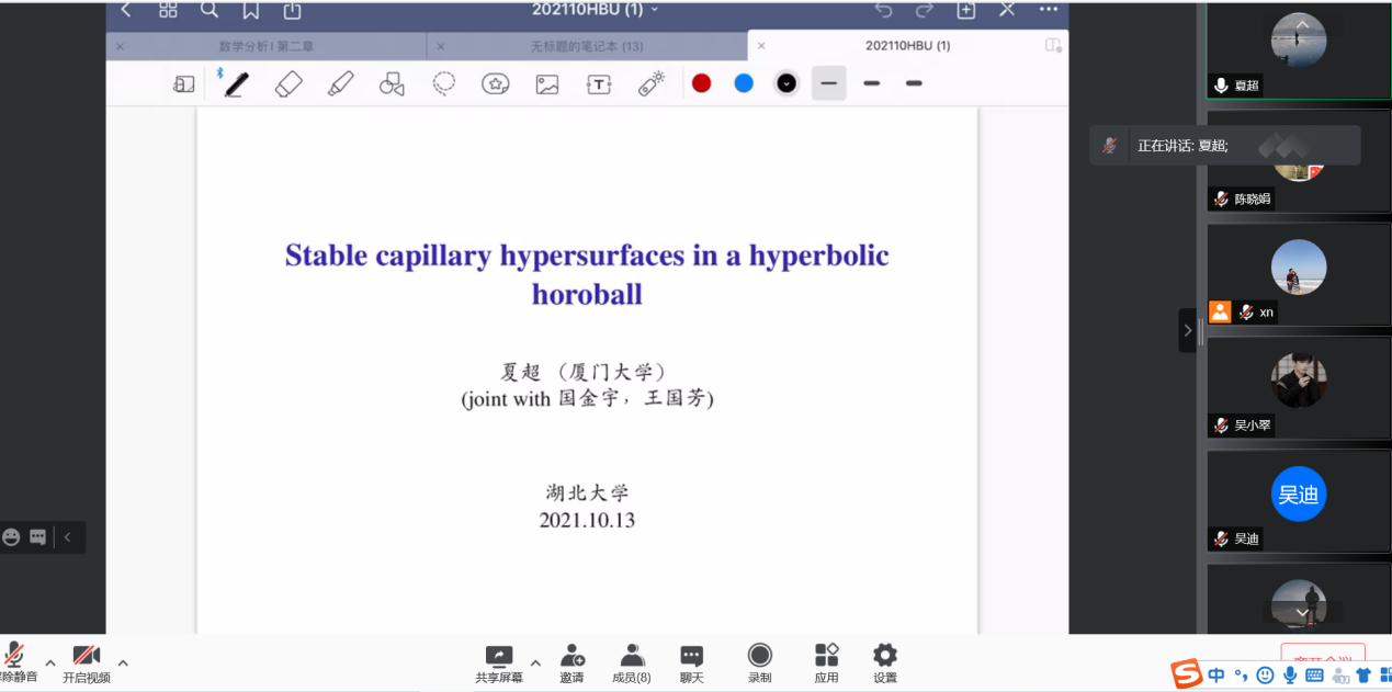 2021年10月13日晚上,厦门大学夏超教授应我院向妮教授邀请,为几何分析团队师生作了题为“Stable capillary hypersurfaces in a hyperbolic horoball”的线上学术报告。