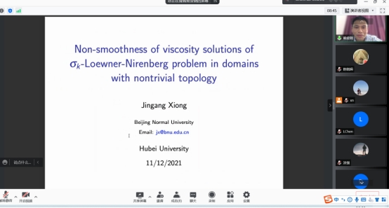 2021年11月12日下午,北京师范大学熊金钢教授应我院向妮教授邀请,为几何团队师生作了题为“Non-smoothness of viscosity solutions of