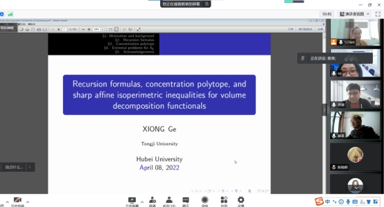 2022年4月8日下午,同济大学熊革教授应我院陈立老师邀请,为几何团队师生作了题为“Recursion formulas, concentration polytopes, and sharp affine isoperimetric inequalities for volume decomposition functionals”的线上学术报告。