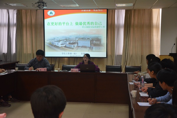甘处长用她幽默风趣的语言,给我院学生干部介绍了世界与中国、学院与学院、学生组织与学生干部的三个平台,同时讲诉了在这三个平台上学生干部该如何去做,才能做最好的自己。甘处长强调,作为大学生,眼界不能仅限于身边的一些小事,更要将眼光放大,去关注自己的国家,了解国家的政策,并多多多拓展自己的视野,再就是从学生工作的角度,首先就是立足于活动的目的,如何才能达到这个目的,然后就是提高作为一个学生工作者的领导力,执行力,以及团队的凝聚力。