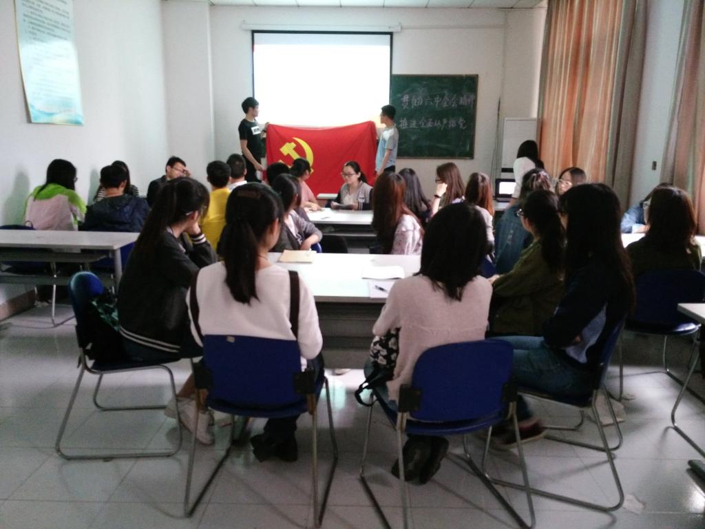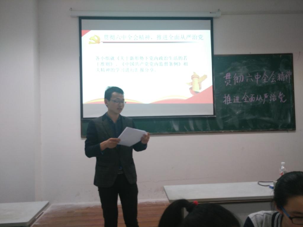 我院非毕业班学生党支部于开展了以“贯彻落实十八届六中全会,推进全面从严治党”为主题的党日活动。首先,党支部全体党员面向党旗,庄严宣誓,重温最初入党的昂扬斗志和青春情怀。本着深入学习,贯彻落实的目标,党员同志们活动前分为四个小组积极学习了《新形势下党内政治生活的若干准则》和《中国共产党党内监督条例》(以下简称《准则》、《条例》)。活动中四个小组先在组内交流学习心得,提出学习疑问,形成小组学习汇报并派出代表在全体党员面前进行发言。罗成辉同志代表小组成员做了以“坚定理想信念”为主题的学习汇报,结合十八大以来部分高官不作为、胡作为、腐败巨贪等令党和人民痛心的现象,强调总结了作为一名党员坚持理想信念的重要性;王丽同志代表小组成员就“开展批评与自我批评”进行了汇报,并将毛主席的“房子是应该经常打扫的,不打扫就会积满了灰尘;脸是应该经常洗的,不洗也就会灰尘满面。我们同志的思想,我们党的工作,也会沾染灰尘的,也应该打扫和洗涤。”与大家进行分享学习。