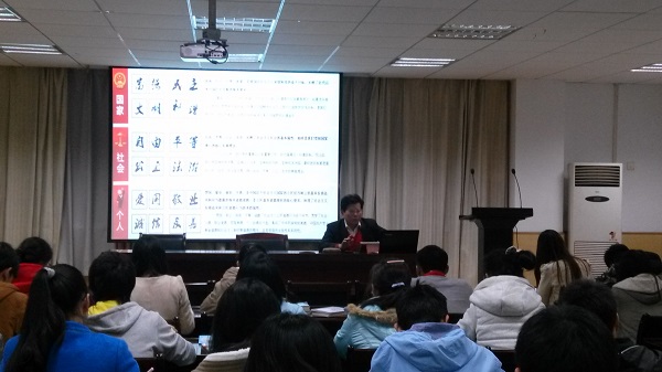 游书记还结合大学生学习生活,从六个方面进行归纳总结:一、社会主义和谐社会的目标和任务;二、社会主义和谐社会的含义与特征;三、和谐校园的含义和特征;四、建设和谐校园的重要意义;五、校风、教风、学风建设是构建和谐大学校园的重要内容;六、当代大学生要成为构建和谐大学校园做贡献。游书记借用毛主席的话“世界是你们的,也是我们的,但是归根结底是你们的。你们青年人朝气蓬勃,正在旺盛时期,好像八九点的太阳。”强调社会是发展的,需要我们大学生“活到老,学到老”,不断汲取知识,扩展思想,才能使社会“和谐”稳定前进。作为一名入党积极分子,要完善自身修养,树立个人形象,宣传党的风貌,形成一种榜样的力量,以个人影响众人,传播当代大学生的品味与格调。