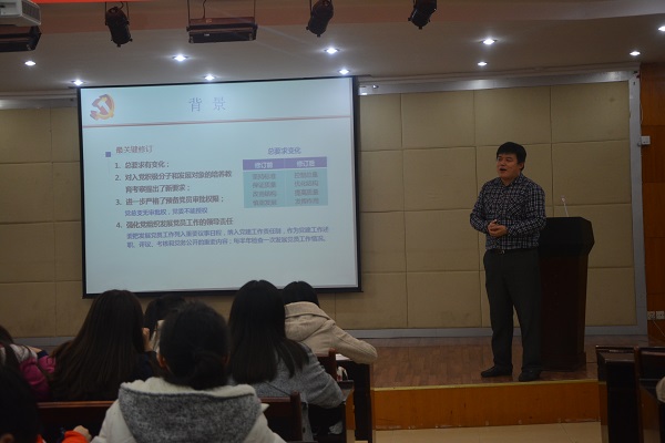 11月15日晚7点,我院第四期党校第六讲顺利举行,院党委副书记陆伟讲授了《中国共产党发展党员工作细则》的内容。我院和计信学院的入党积极分子以及发展对象一同参加学习。