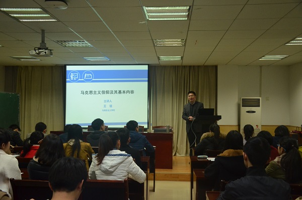 开班典礼结束后,马克思主义学院党委副书记王雄为入党积极分子们作了题为《马克思主义信仰及其基本内容》的专题讲座。王雄从数学史上的第一次危机开始谈起,讲到了有些人可以为信仰杀害他人,也有些人可以为了信仰而牺牲生命,从侧面揭示了信仰对人的重要性。之后,通过分析各个宗教信仰的教条和行为,他带领入党积极分子们认识到了信仰不等于宗教信仰,有信仰不等于有道德这一事实,从而告诉大家信仰的正确理解是什么。