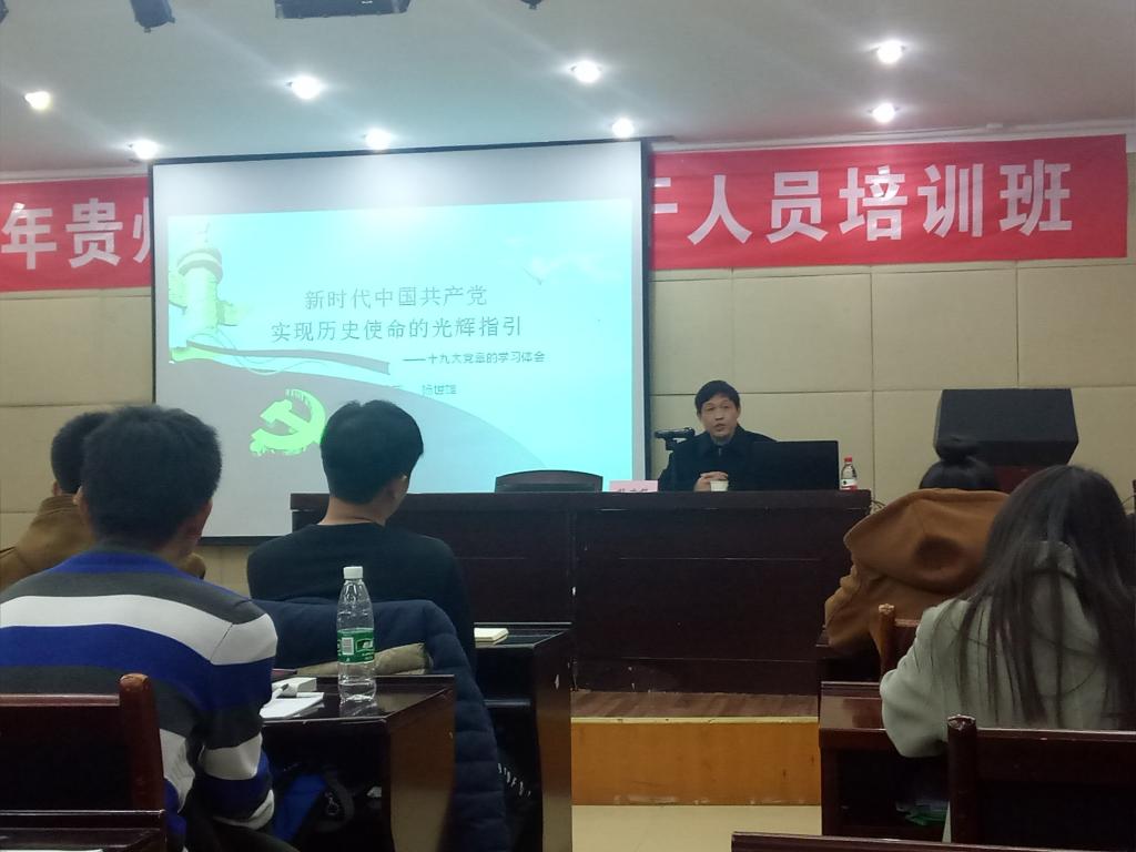 2017年11月26日晚七点,湖北大学数学与统计学学院第五期党校第4讲在湖北大学院八楼成功举办。本次讲座邀请到了湖北大学党委正处级组织员、组织部副部长杨世雄给本期学员做辅导报告,报告的主题为“新时代中国共产党实现历史使命的光辉指引”。