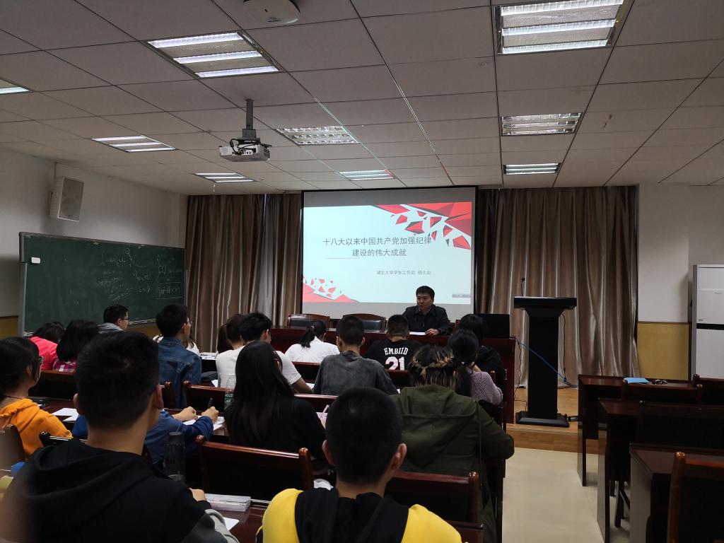 本次党课在大家热烈掌声中拉开了序幕。杨处长以PPT的形式介绍了几个关于纪律的基本概念以及十八大以来中国共产党加强纪律建设的新举措,接着他将党的理论知识结合自身工作经验娓娓道来,让同学们切实感觉到纪律在学习上、生活中的重要性,以及作为一名党员要在纪律上严格要求自己。杨处长提到,重视纪律建设是加强党的建设的一条重要历史经验。同学们在日常的学习和生活中也要严守各项规章制度,做一名遵纪守法的好学生。