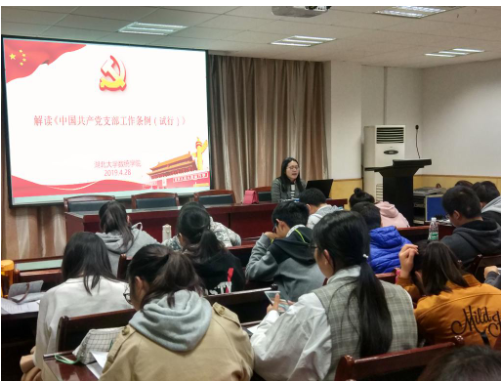 2019年4月28日晚,海角天涯社区网页入口登录第七期入党积极分子培训班第六讲在数统201报告厅开讲。此次党课学习邀请了数统院的辅导员马荣老师为学员们作《中国共产党支部工作条例(试行)》辅导报告。