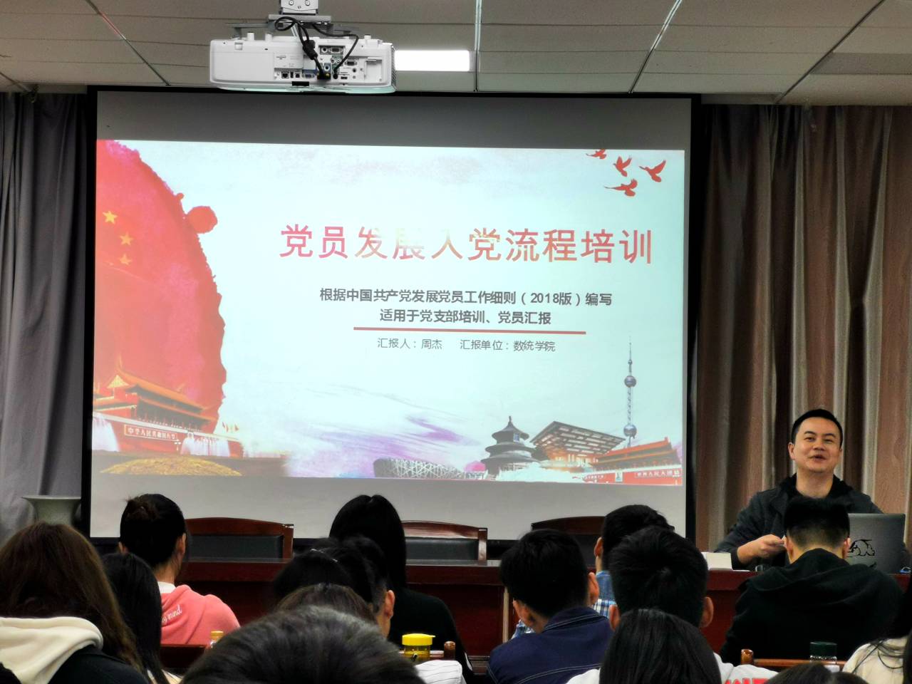 湖北大学数学与统计学学院第八期党的基本理论知识培训班第四讲于2019年11月8日下午18:00在数学与统计学学院201教室进行。本次党课培训的主讲老师为海角天涯社区网页入口登录团委书记、组织员周杰老师,培训主题为党员发展及入党流程。