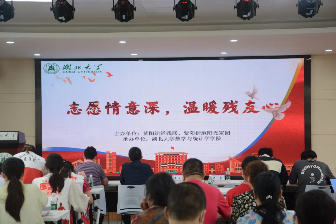 在全国第34个助残日之际,为进一步推进紫阳街道志愿助残服务事业的发展,“志愿情谊深,温暖残友心”紫阳街道全国助残日活动于5月19日上午在湖北大学数学与统计学学院八楼会议室顺利举行,参与此次活动的有紫阳街道残联副理事长黎斌、紫阳街道阳光家园园长、武汉楚馨社会工作服务中心督导肖慧敏、湖北大学数学与统计学学院党委副书记王文锋、湖北大学数学与统计学学院团委书记陈慧、残疾人士代表及紫阳街道高校志愿者团队代表。