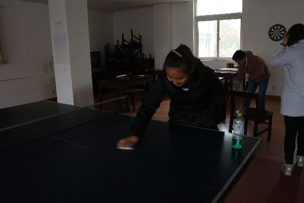 与此同时,另一拨青年传媒中心的同学们正在打扫教职工活动室。大家先仔仔细细把活动室每个角落都扫了一遍,拖了一遍,接着同学们又把乒乓球台和老师们下棋的棋盘擦拭干净,最后将角落的椅子也摆放整齐了。大家想着:这可是老师们日常活动的地方,要让这里保持干净、整洁,老师们就会有好的心情,上课自然也开心很多。