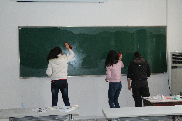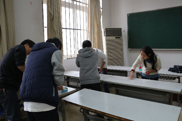 分配在一楼的社团联的同学们先开始清扫101教室,101教室是自习室,平常有很多同学在里面自习,但是缺乏打扫,长年累月下来自习室就变得比较脏,所以同学们首先对它“开刀”。看到桌面不干净,大家就先把上面的书本都整理到一边,然后用抹布当作武器,对桌子上的污垢开始发起猛烈的攻击。不一会,桌子就被擦得焕然一新。