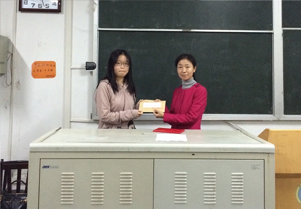 颁奖仪式上,张莎莎老师向胡愉同学颁发了证书和奖金,并勉励她努力学习,能够在数学专业领域有所成就。