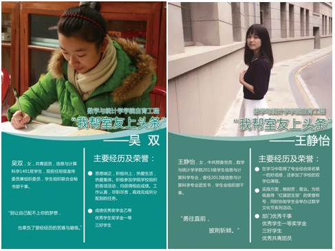 本次活动以照片(数张)和故事结合的形式完成作品,内容涉及关于学习、生活、相处的点点滴滴,选取较为典型的故事之后最终形成一份完整的申报材料,以此发挥先进典型学生的模范带头作用,鼓励我院广大青年学生将文化知识学习、个人能力素质锻炼和思想品德修养提升紧密结合,将思维创新与社会实践紧密结合,将全面发展与个性发展紧密结合。最终,共有十名同学被推举出来。这十名同学政治立场坚定,思想素质过硬;学习刻苦,成绩优秀;积极参加社会实践活动;寝室关系融洽,积极向上。