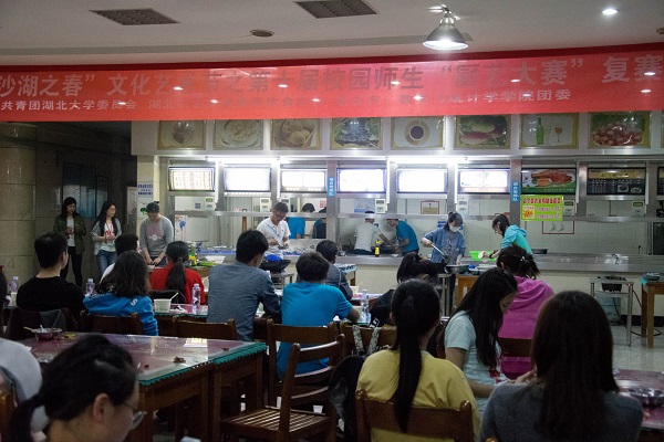 16组参赛选手,16道美味佳肴。4月25日晚七点,湖北大学数学与统计学学院第十届校园师生厨艺大赛复赛在嘉会园食堂二楼火热举行,此次大赛为湖北大学第二十九届“文化艺术节”系列活动之一,由共青团湖北大学数学与统计学学院委员会和后勤集团饮食中心共同举办,来自商学院、新闻传播学院、体育学院等学科性学院的35名学生进入复赛比拼厨艺,大显身手。由我院学工办老师,食堂大厨和各学院学生组织主席构成评委团,根据选手所做菜肴的色香味进行品尝打分。比赛选出六组学生进入决赛,与学校老师共同角逐“校园厨神”称号。