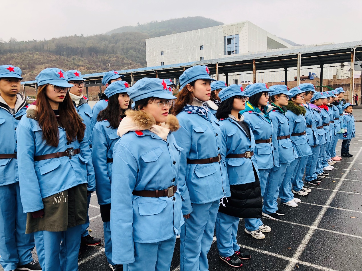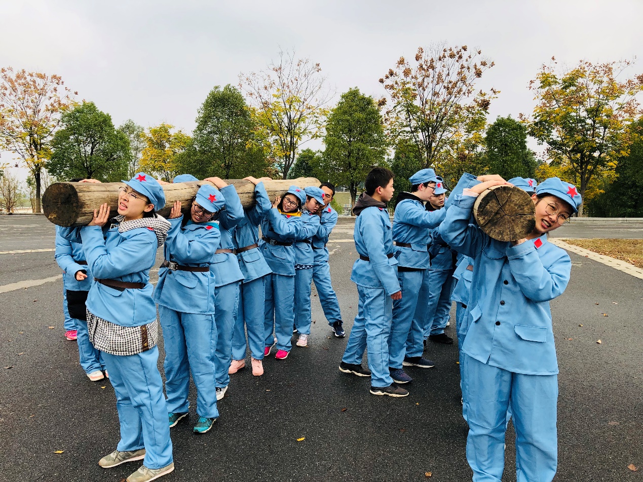 活动伊始,成员们被分为三组,每组自行推选出一名队长,每个小组经过讨论制定出自己队伍的队名、宣言口号及队列造型。随后,拓展训练共设置了“进化论”、“极速60秒”、“中空挑战”、“铜墙铁壁”、“扛圆木”五个具有创意的游戏比赛项目,队员们密切配合,动作机敏,生怕落后。活动的过程中也是充满了欢声笑语,处处可以感受到团队合作的力量。在最后一个比赛项目“扛圆木”中,由于各个队员们身高不一,所以团队配合显得更为重要,男生们主动扛起了大部分重量,而女生们也不曾歇息。五个比赛结束后,教练带领着全体成员来到国防教育馆参观和学习,感受国家的强大,追寻红色革命记忆。