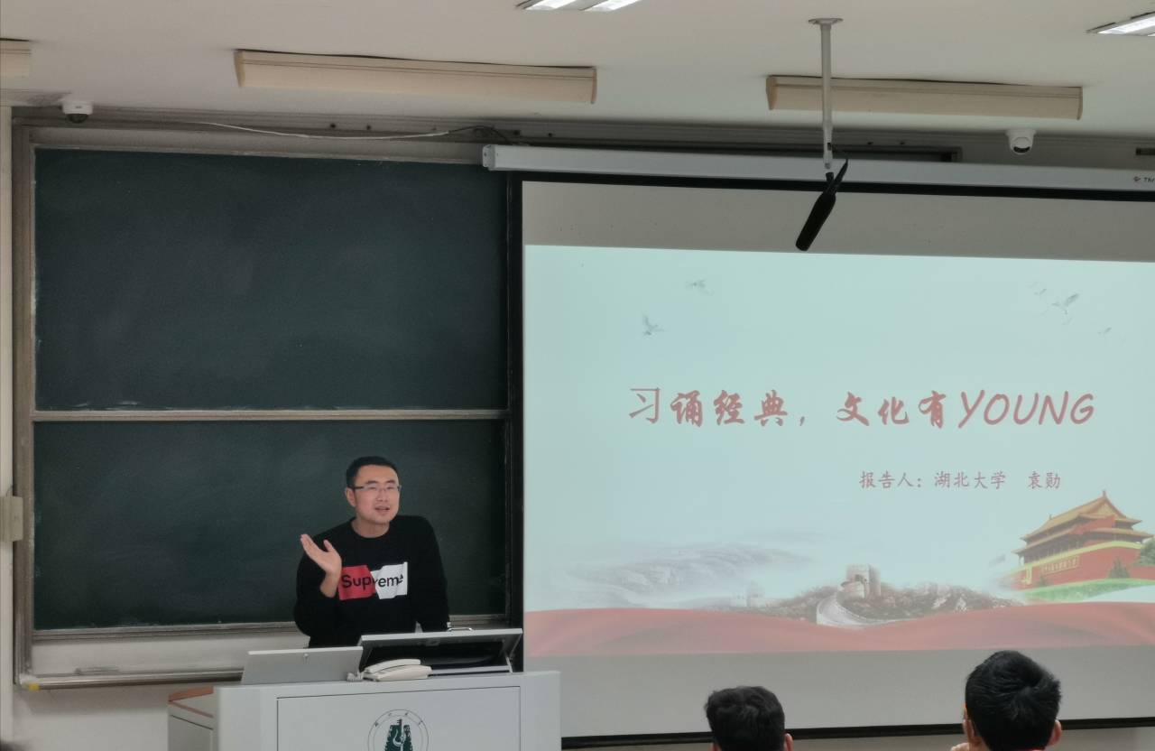 湖北大学数学与统计学学院第三期团课学习于2019年11月22日下午18:00在教四209教室进行。本次由物电学院团委书记袁勋为大家上课。主题为“习诵经典,文化有Young”。
