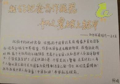 此次团日活动由组织部陈溢纯在线主持。团日活动在分享团歌音频中拉开帷幕,紧接是以团小组为单位进行分享,分享内容为前期小组讨论的学习成果。第一组在小组长的带领下学习了有关武汉金银潭医院院长张定宇的故事,张定宇同志隐瞒了身患渐冻症的病情,顾不上感染新型冠状病毒感染的妻子,依然坚守在抗疫前线,他用渐冻的生命与千千万万白衣天使一起,托起信心与希望,托起无数人的生命与健康;第二组由小组成员分别讲述自己的所见所闻,有的同学提到了为受灾地区慷慨解囊的工人、农民,有的同学提到在基层收集资料的党员,还有同学提到了投身于志愿服务的志愿者以及投身一线的医护人员,正是他们撑起了我们的保护伞才将疫情控制在了一定范围之内;第三组集体观看了视频“三十三”,视频记录了这次战“疫”中的逆行者们。从外卖小哥、高速司机到一线医护人员、人民军队,每个人都逆行在这场战“疫”中;第四组观看了讲述佛山市中医院疫情期间火速集结,驰援湖北,直奔疫情最前线的视频并了解了金银潭医院院长张定宇的故事,小组成员分别讲述了自己身边的逆行者;第五组通过观看视频了解到许许多多的平民英雄,不畏疫情,冲在前线,帮助人们度过艰难的时刻。最后,团日活动在《逆行者,我想对你说》的视频中结束。