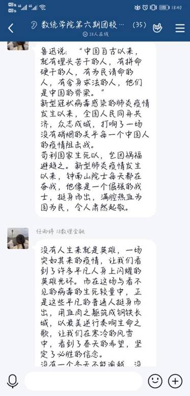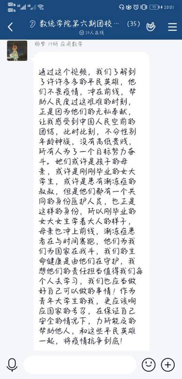 在全国上下抗击新型冠状病毒感染的肺炎疫情战役中,有那么一群人毅然奔赴抗疫前线,不忘初心,不畏生死,勇敢地向前!那就是“最美逆行者”们!为增强新时代大学生的责任感和使命感,学习一线工作人员“逆行而上”的勇气和“救死扶伤”的奉献精神。2020年4月1日,湖北大学数学与统计学学院2020年第一期团校举行以“致敬抗疫逆行者”为主题的线上主题团日活动。
